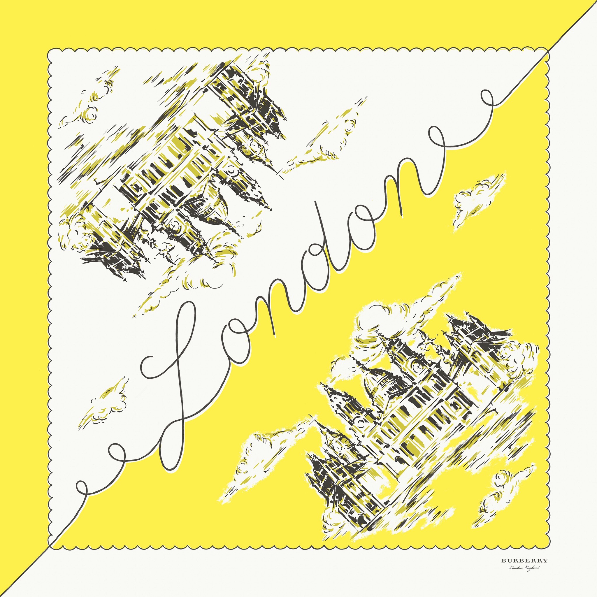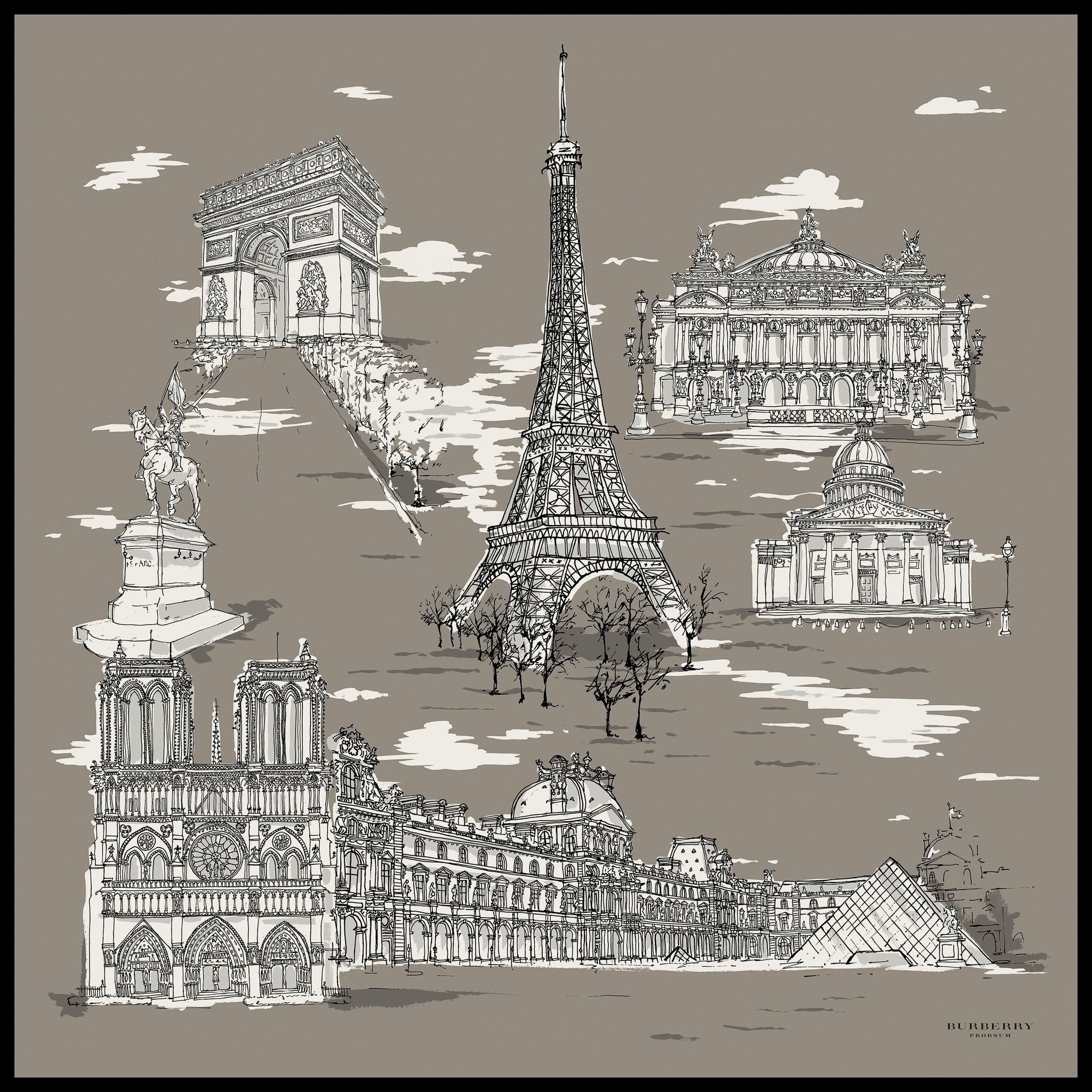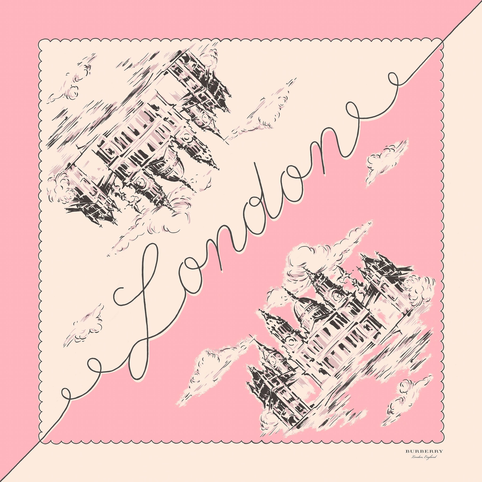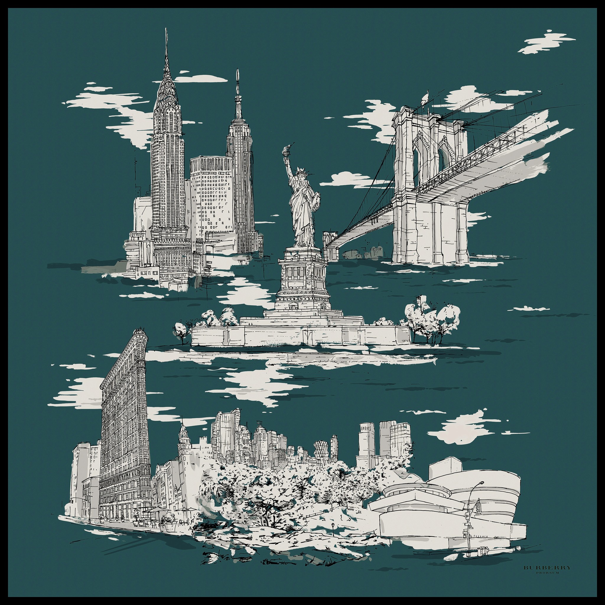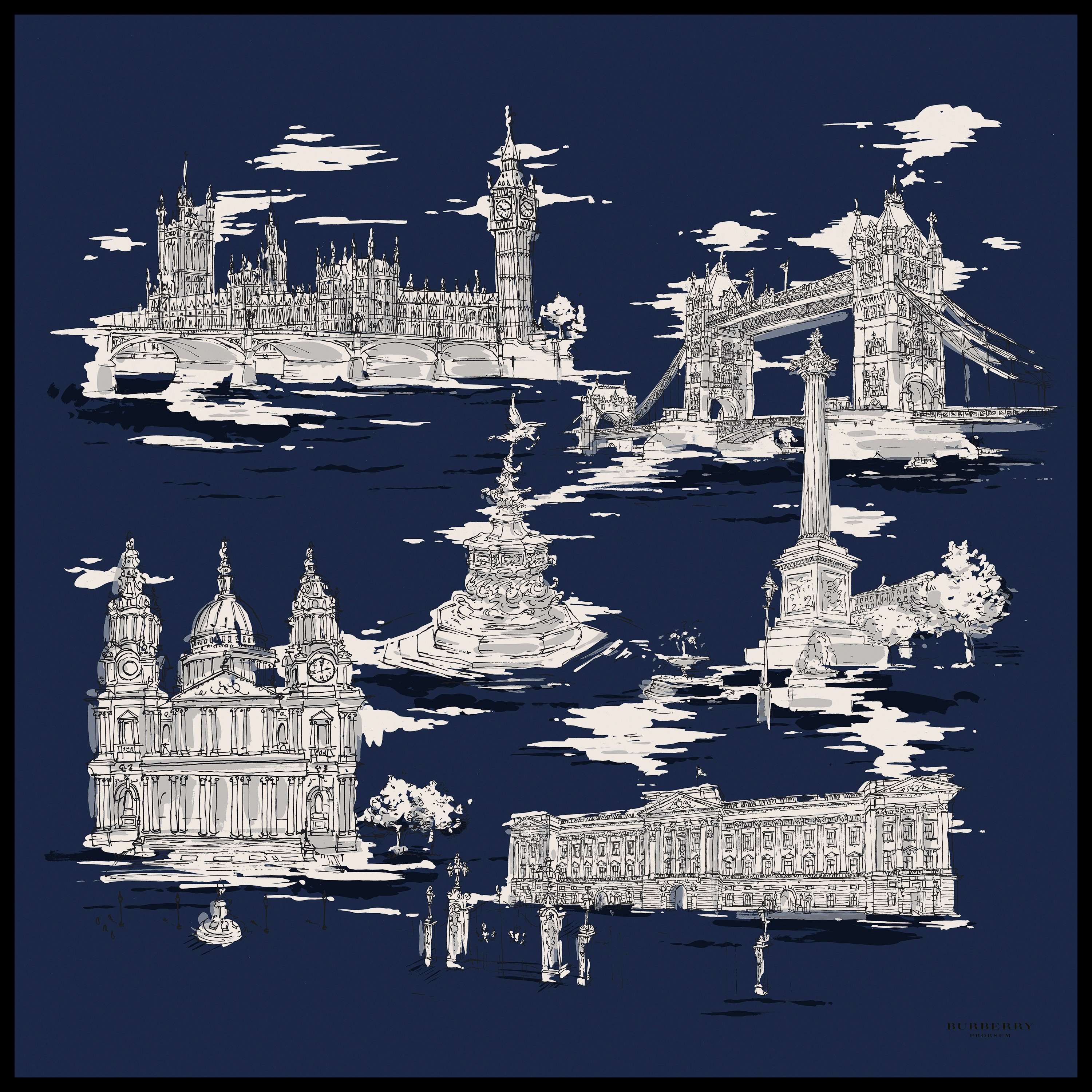 The inspiration behind the prints for the Pre-Fall and Fall 2014 collections stemmed from London landmarks and souvenirs. I designed and illustrated a series of silk squares featuring famous buildings and skylines of cities where Burberry flagship stores are located. Both collections featured pen and ink drawings of London, Paris, New York, Shanghai and more, which adorned T-shirts, umbrellas, and scarves.