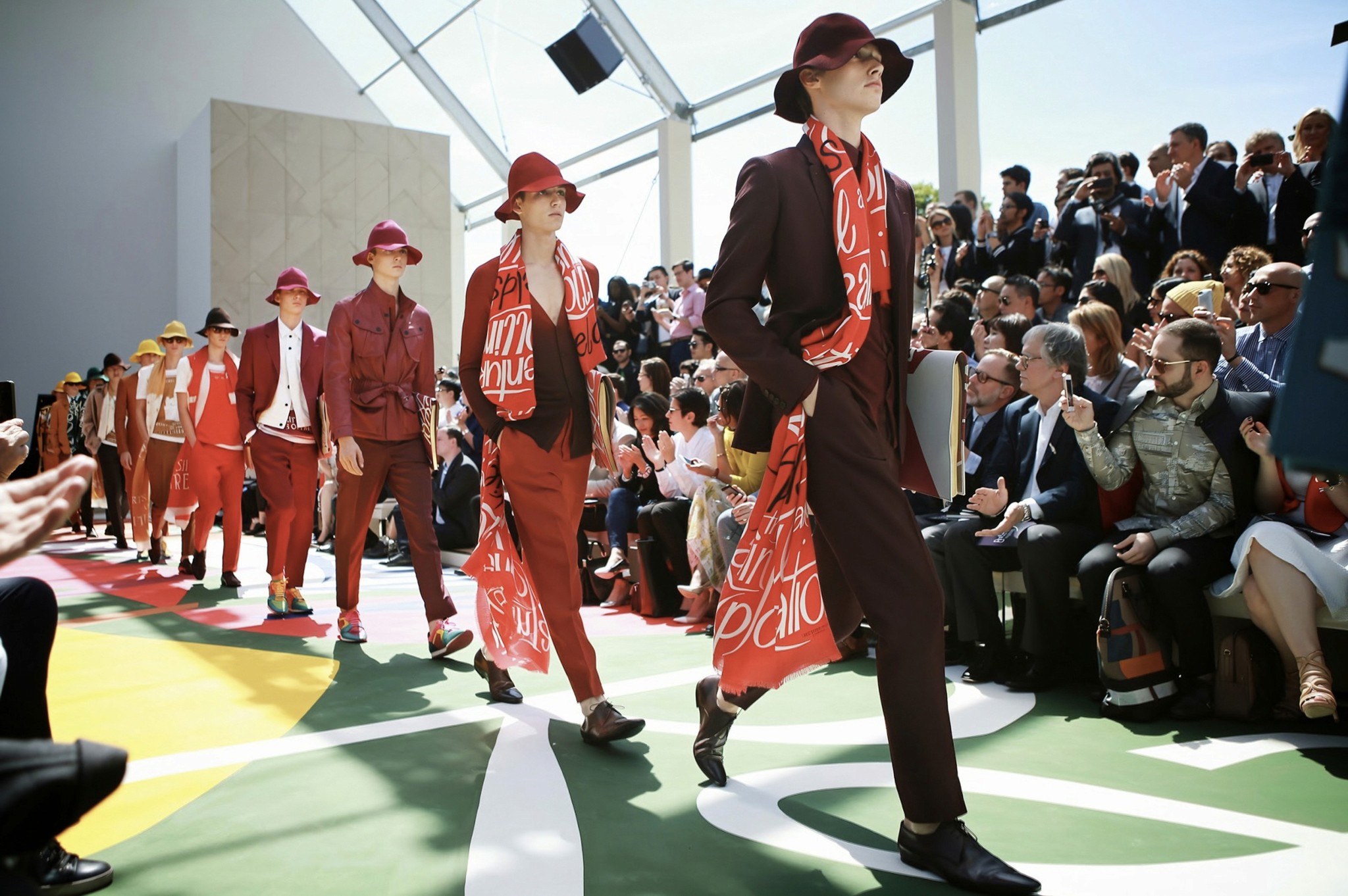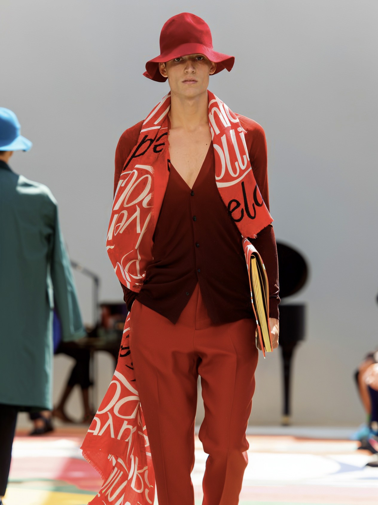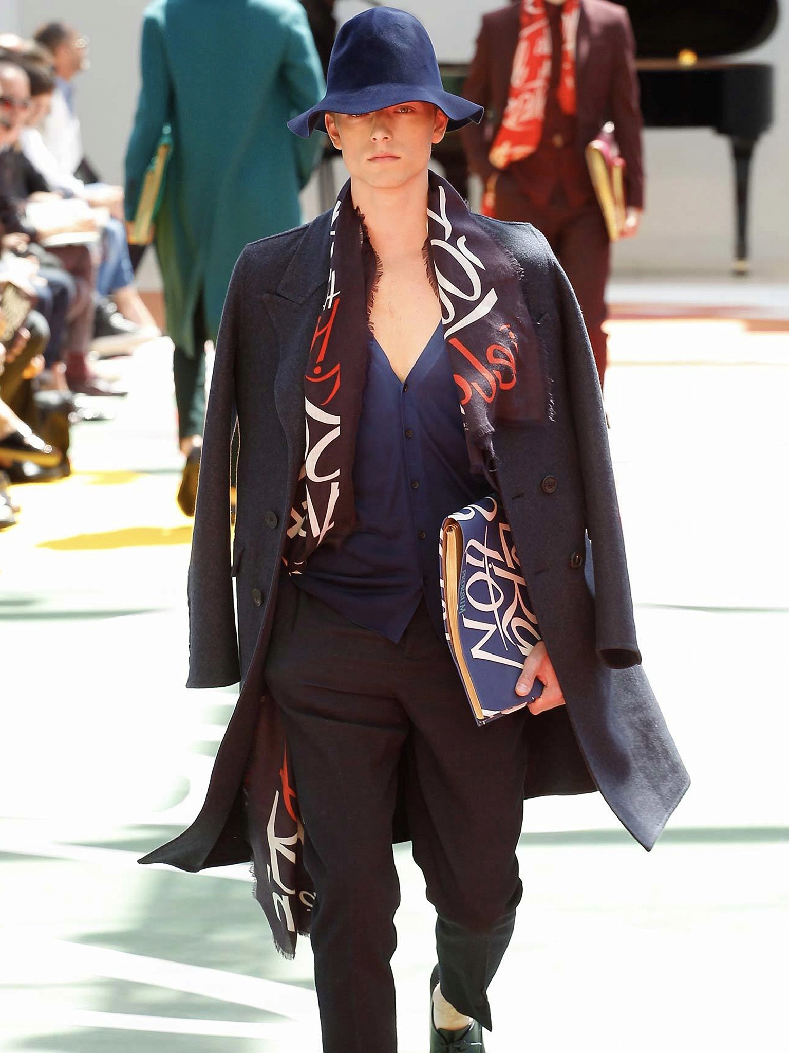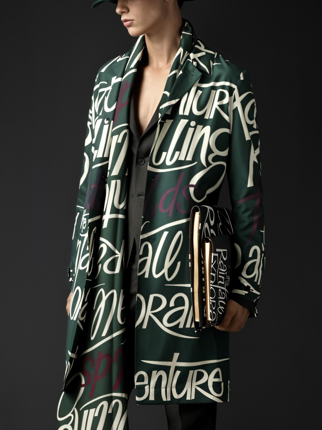 "The weathered colors and graphics of old book covers were a perfect complement to Chatwin-as-inspiration. So were the words printed on a leather jacket, a trench, and a weekend bag: "Adventure!" "Exploration!" It was the purest expression of the Burberry ethos that we've seen for some time."